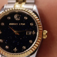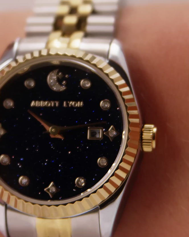 Gaze at starry nights all day long with this two tone watch, featuring a blue sandstone gem dial and beautiful star and moon details. Part of the To The Moon And Back Collection, this Limited Edition watch is perfect for everyday wear and brings subtle nighttime glamour to any outfit. With limited numbers available, treasure for yourself or gift to a friend you care deeply about.